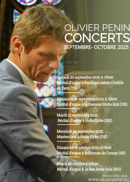 Mardi 12 août 2025 à 20h30 Luchon (F) Plus d’informations Samedi 20 septembre 2025 à 17h00 Basilique Sainte-Clotilde à Paris (F) dans le cadre des Journées du Patrimoine Plus d’informations Dimanche 21 septembre 2025 Holte Kirk (DK) Plus d’informations Dimanche 12 octobre à 17h00 Cernay, Saint-Etienne Plus d’informations Mardi 28 octobre à 20h30 Oslo, Røa kirke (NO) Plus d’informations